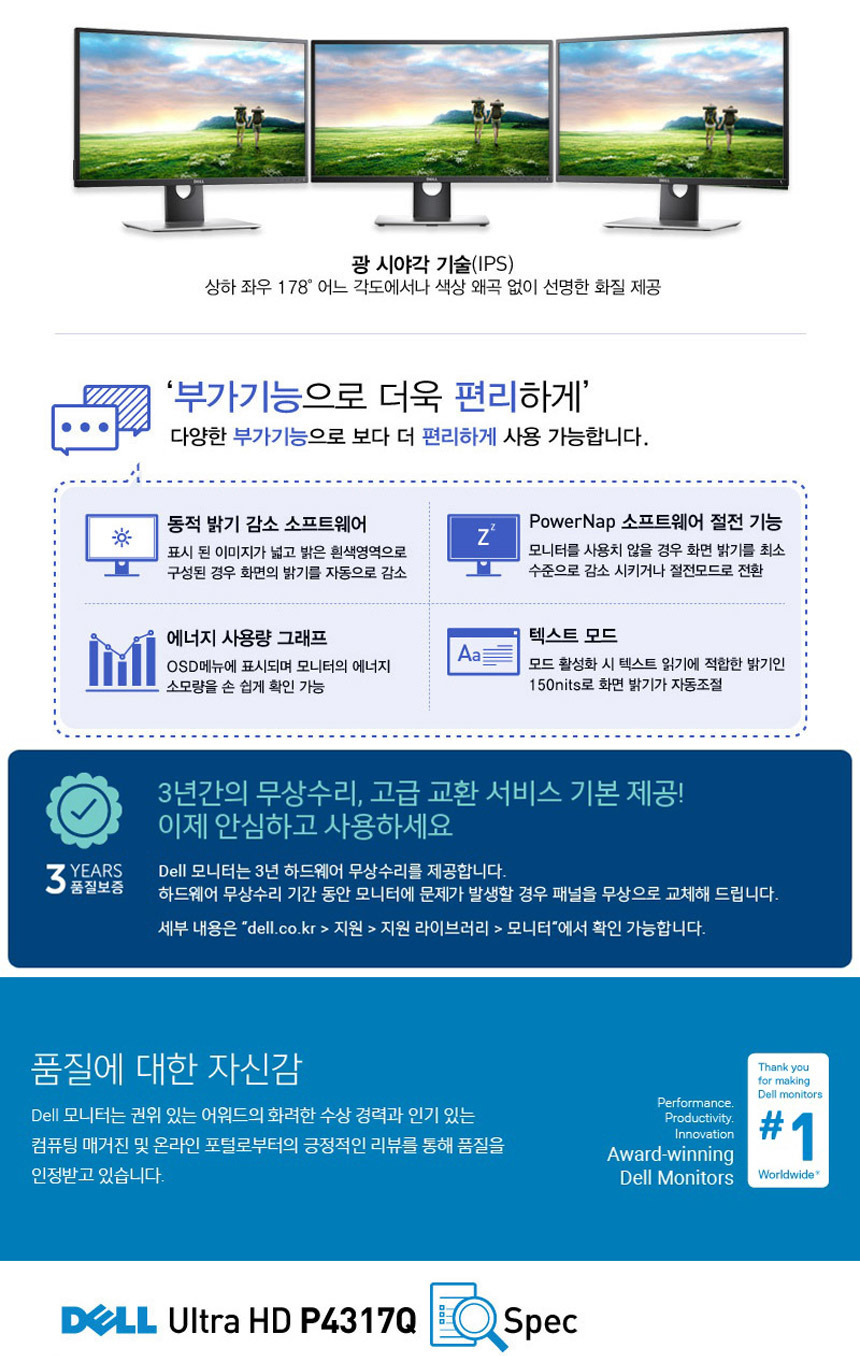 DELLP4317Q는42.51인치(약43인치)의대형IPS패널을탑재한4KUHD(3840x2160)해상도의모니터입니다.한번에넓은작업공간을제공해,여러창을띄워도답답함없이쾌적하게사용할수있습니다.178도광시야각과선명한색상표현력으로,어느각도에서나일관된화질을자랑합니다
