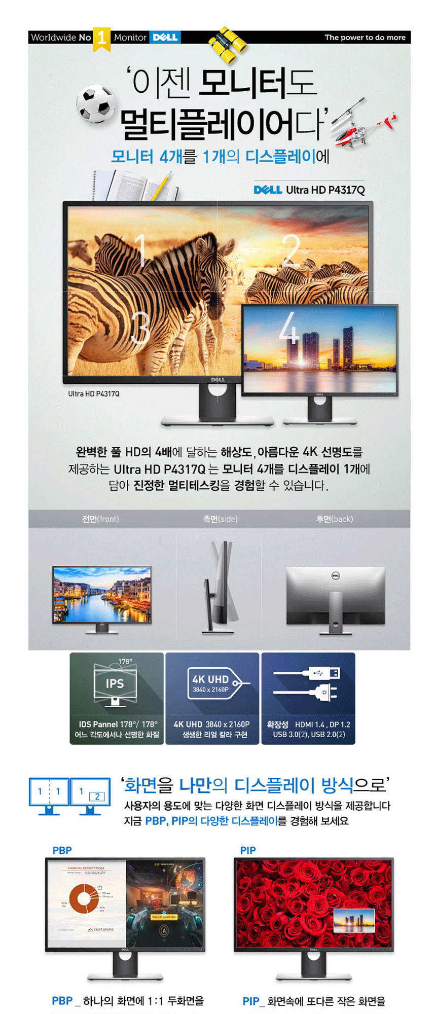 DELL P4317Q는 4K UHD 해상도의 대형 화면, 다양한 입력 지원, 멀티 클라이언트 기능 등으로