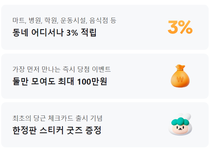 - 해당 카드로 자신이 설정한 동네 가맹점에서 결제 시 결제 금액의 3%를 당근머니로 적립